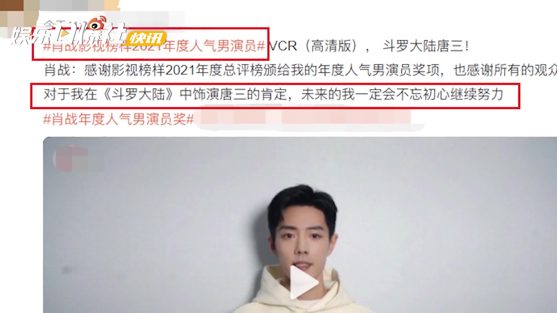 视频:视频:肖战凭《斗罗大陆》获年度人气男演员 热巴获人气女演员
