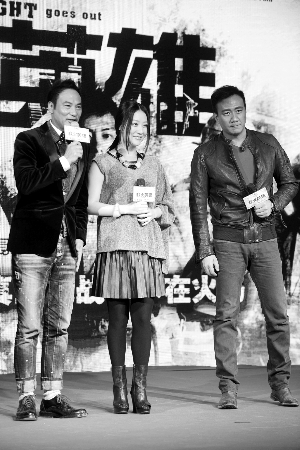 昨日《救火英雄》发布会上,白冰(中)结婚一事,同场演员如任达华、胡军等人都不知情,胡军还说白冰“太不仗义”了。信息时报讯 (记者 陈爽) 今年有两部火灾题材的电影相继上映,此前刘青云[微博]、古天乐[微博]主演的《逃出生天》已经公映,票房1.3亿元,算是有所交待。2014年1月3日,谢霆锋、余文乐[微博]、胡军等主演的《救火英雄》即将与观众见面,该片昨日在广州举行媒体试映会。