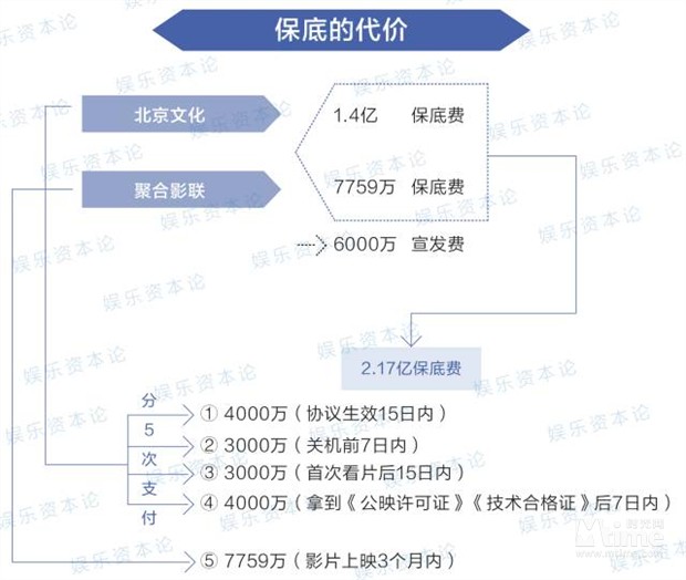 值得注意的是,前4期的款项都是由北京文化支付,累计1.4亿,最后一笔7750万元由聚合影联支付。不过,聚合影联在这笔资金之外,还需要额外垫付6000万元的宣发费。