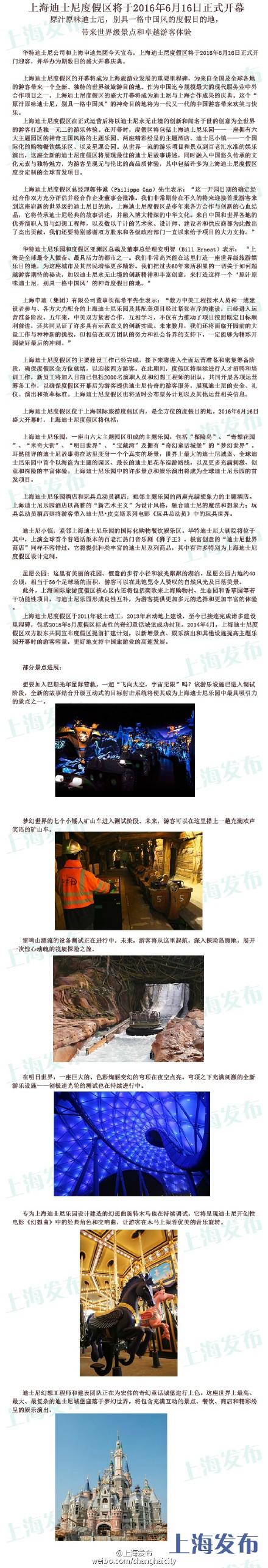 华特迪士尼公司和上海申迪集团今晨宣布,上海迪士尼度假区将于2016年6月16日正式开门迎客,并举办为期数日的盛大开幕庆典。