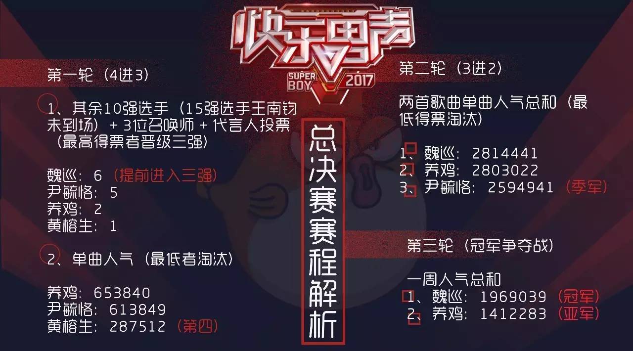 1969039票对1412283票,15强中唯一的80后魏巡以50w票优势成为本届冠军。