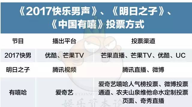 当流量积累到一定程度,任何内容都可以变现。投票营收只是其中一部分,业内人士L表示。2005年的超级女声就曾获得单场比赛上千万投票营收。《2017快男》、《明日之子》、《有嘻哈》的投票渠道主要分为四种: