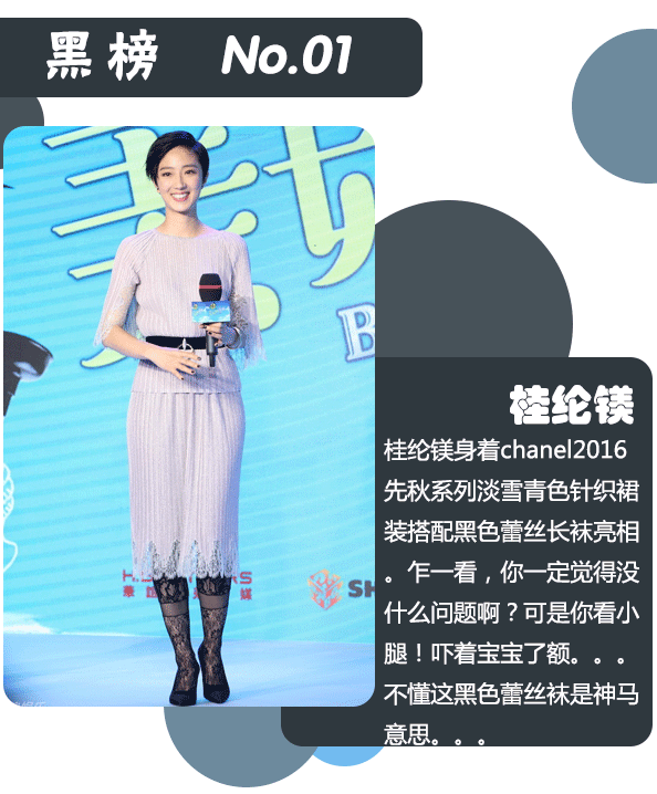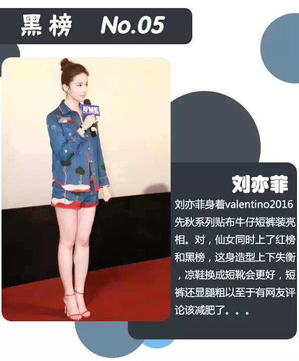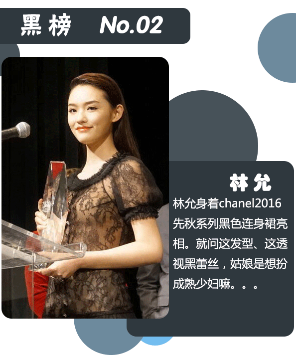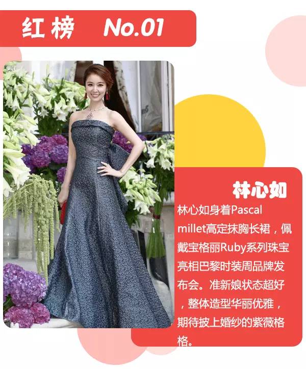 本周红榜依次林心如、刘亦菲、张梓琳、周迅、李冰冰;本周黑榜依次为桂纶镁、林允、胡杏儿、王鸥、刘亦菲。