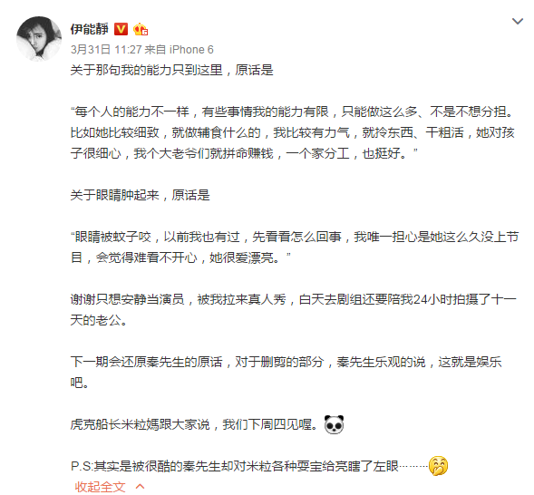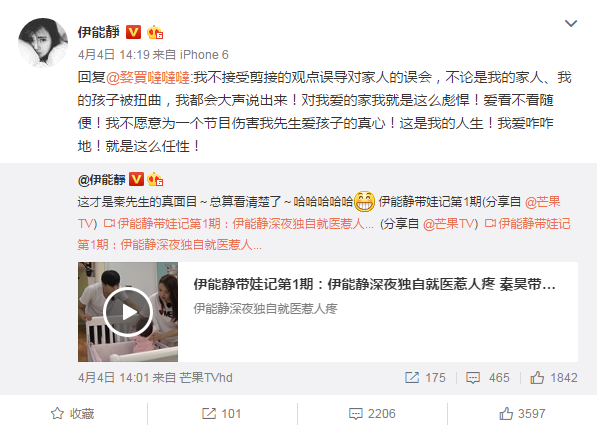《妈妈是超人2》第一期播出后,网络上铺天盖地都是声讨秦昊冷漠带娃的评论,伊能静无奈中带着愤怒,连发数条微博力证老公“清白”。
