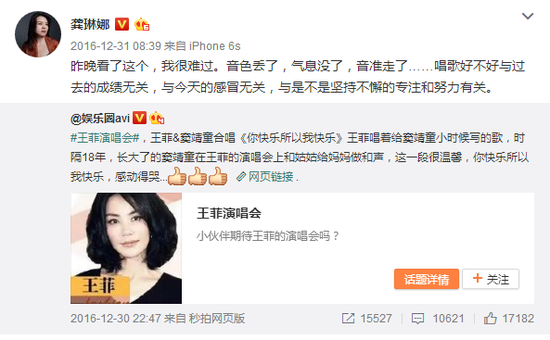 12月31日上午8点,龚琳娜转发了一位娱乐博主的微博,并评价王菲“音色丢了、气息没了、音准走了……”还直言唱歌好不好与过去的成绩无关。