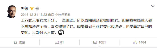 随后老锣也发微博说王菲走调,还顺便批评了一波王菲的粉丝,说大家故意对天后的问题视而不见。
