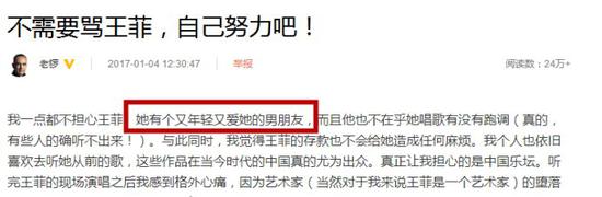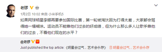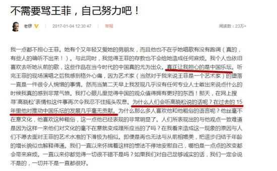 1月2号,老锣又转发了一遍自己批评王菲的长文,继续表示歌手不能只靠过去的成绩。