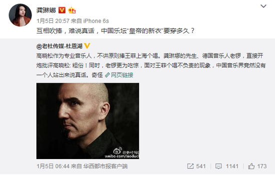 1月6号炮轰继续升级,先是华西都市报的记者说高晓松不讲原则追捧王菲,于是龚琳娜转发微博说高晓松王菲“互相吹捧”,还表示中国的乐坛是“皇帝的新衣”,大家都知道是欺骗但没有人敢讲出来。