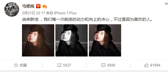 巧合的是,在欧豪探班的当晚,马思纯发了一条微博,说“我们每一次前进的动力和向上的决心,不过是因为喜欢的人。”