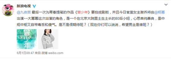 最近杨幂官宣了一部根据九夜茴同名小说改编的青春爱情剧《曾少年》,男主人选待定,但网传是张若昀。
