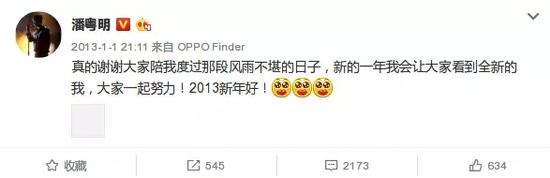 2013年,潘粤明发了一条感谢的微博,只是当时的评论和点赞数相比同期的明星来说少的可怜。