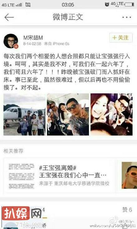 凌晨王宝强在微博上发布离婚声明,表示妻子马蓉与他的经纪人宋喆(宋哲)发生了不正当的两性关系,严重伤害了家庭,因此决定和马蓉离婚。