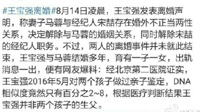 有网友爆料说王宝强去 北京第二医院做了亲子鉴定,DNA相似程度只有2%-8%。