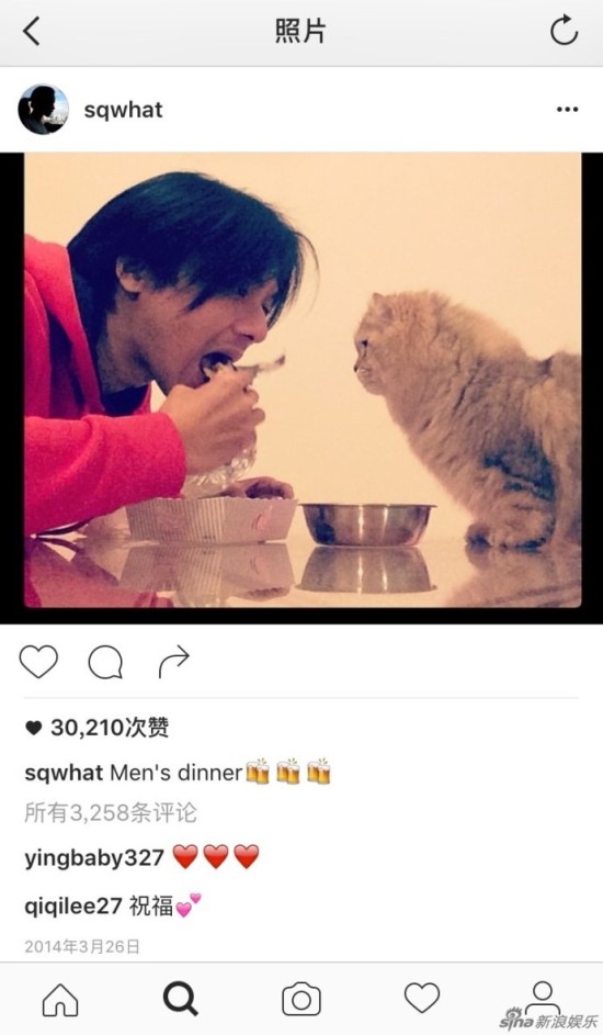 她也会在社交网络上大方晒他和猫的照片: