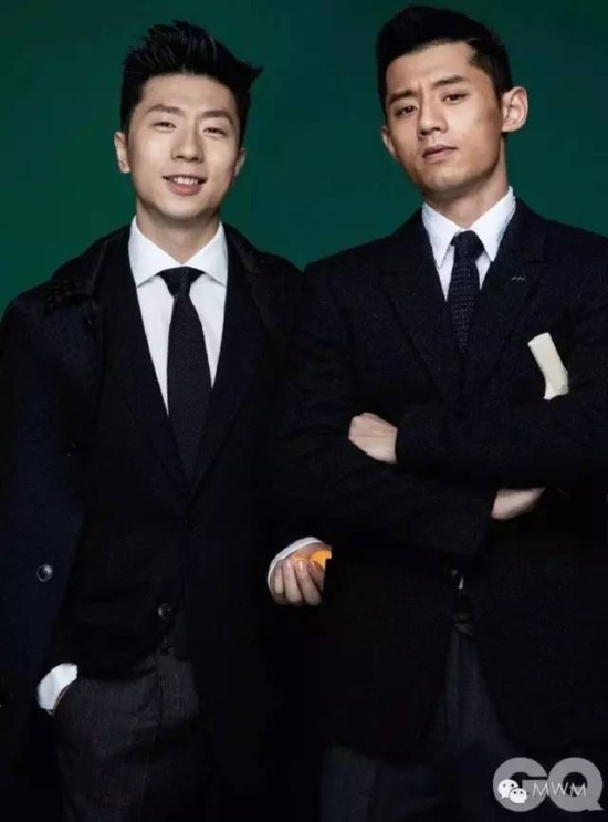 这件大事是《GQ智族》做的(嗯!干得漂亮!),照片是摄影师李奇拍的。张继科和马龙把运动服脱了(尤其是脱掉了张继科小蓝鞋),老老实实穿上了西装,工工整整系好领带。