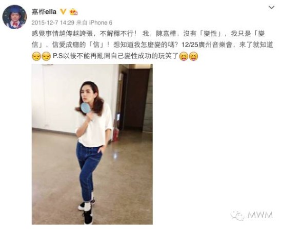 直到出道10年之后,SHE宣布三个人将会单飞但不解散,一直短发的Ella才开始留起了头发,离开SHE的时候,她演了戏,主持节目,她是陈嘉桦。
