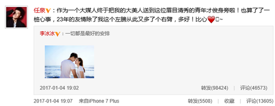 可最令吃瓜群众意外的,还是微博已经彻底沦陷的任泉,也第一时间转发微博祝福李冰冰,并自认为李冰冰的爱情牵线:“作为一个大媒人终于把我的大美人送到这位眉目清秀的青年才俊身旁啦!也算了了一桩心事,23年的友情除了我这个左膀从此又多了个右臂,多好!比心~”