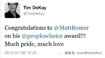 而马特•波莫(昵称孔雀)也凭借刚刚完结的《猫鼠游戏》(WhiteCollar)拿下了最受欢迎剧情类电视剧男主角的奖项。而剧中和生活中的基(zhen)友(ai),饰演警探Peter的蒂姆•迪凯也第一时间在推特上表现了他的爱意(划掉)和祝贺——“满满的骄傲,满满的爱!”