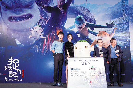 票房已破10亿元的奇幻电影《捉妖记》昨日在京举行“小妖王”胡巴签约续集仪式。出品人江志强表示签约是为了保护“票房萌宝”,而再度“喜当爹娘”的白百何、井柏然以“最佳拍档”亮相,小井感谢导演让自己怀孕,小白则自爆儿子看电影时哭了三次,还想批评小井哥哥。