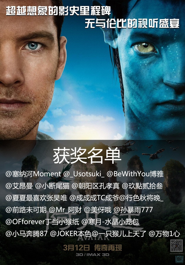 所有中奖团员请于3月14日 23:59前使用[用手机客户端或电脑客户端的微博电影点评功能]点击进入微博电影《阿凡达》点评页提交不少于140字的原创观后感,欢迎大家使用写长评功能发布长影评。