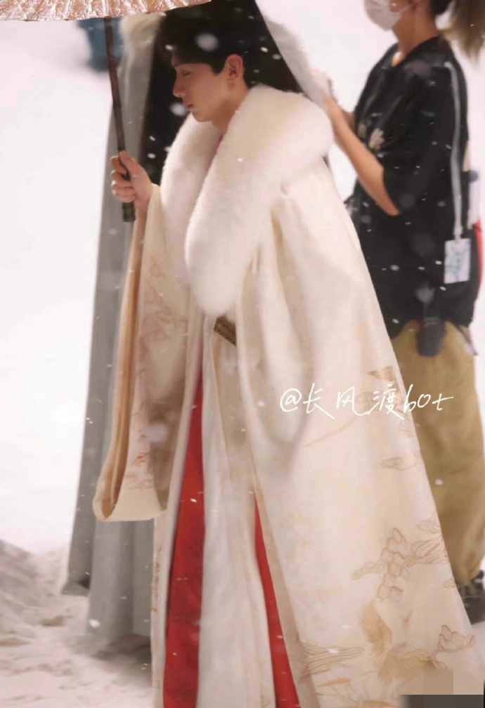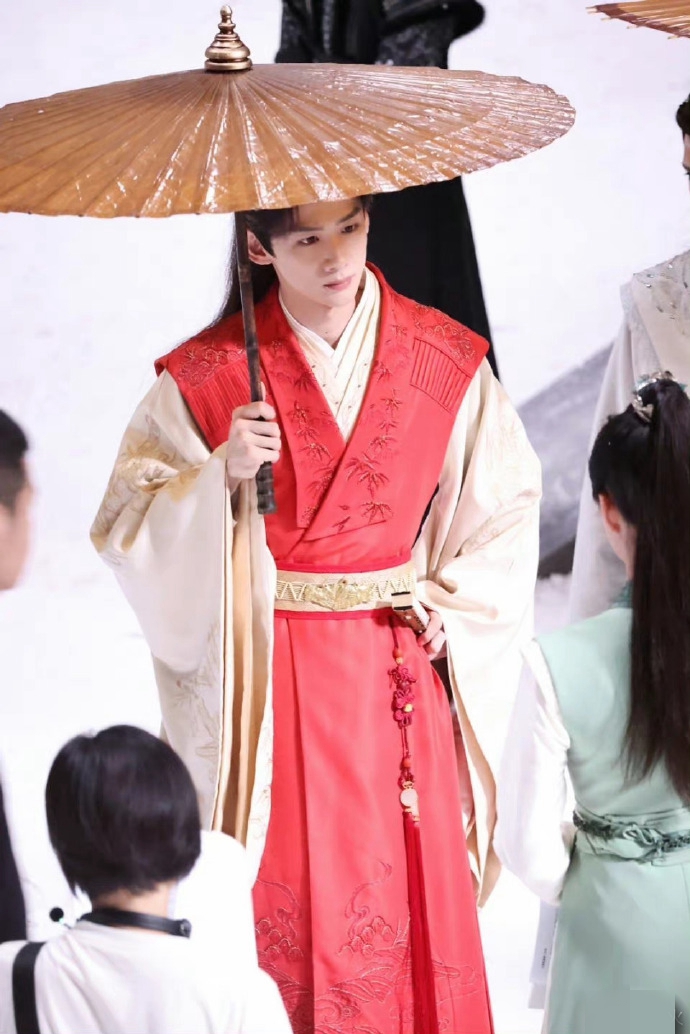 照片中白敬亭穿一身红衣,在雪中撑伞,尽显翩翩公子气质,氛围感满满。