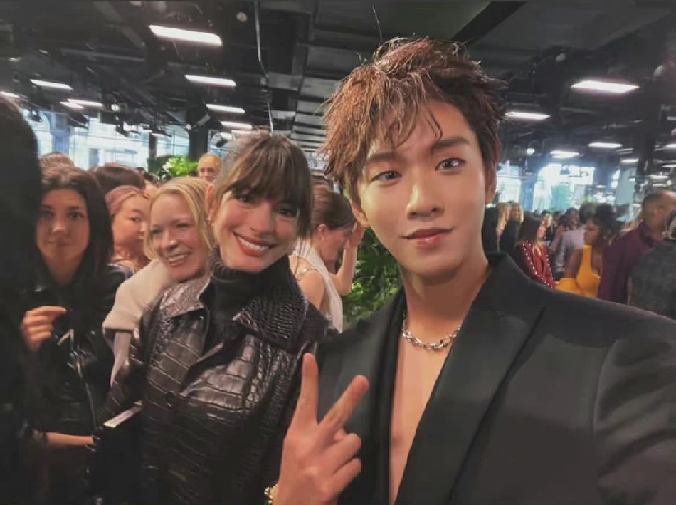 余景天亮相纽约时装周看秀,真空西装造型帅气。他在社交平台晒出与安妮海瑟薇的合影,梦幻同框!