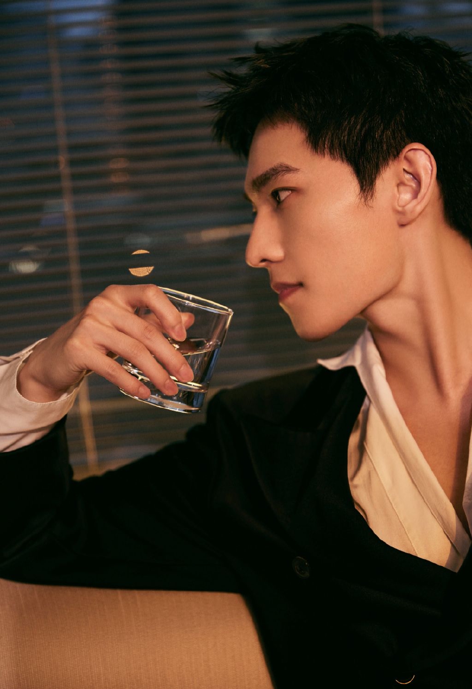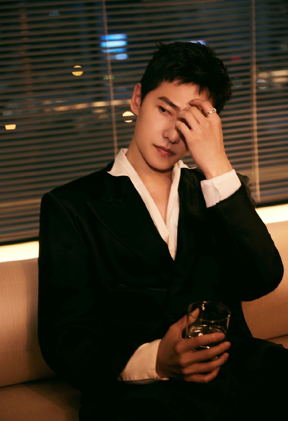 杨洋身着宽松西装,整个人慵懒不失贵气。下颚线精致锋利,在暖色灯光下手握酒杯帅气有型。