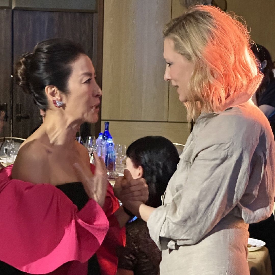 Twins同框大片释出,阿娇身穿素面铺花礼服,国风韵味十足,阿sa着黑色绣花礼服,笑容灿烂。