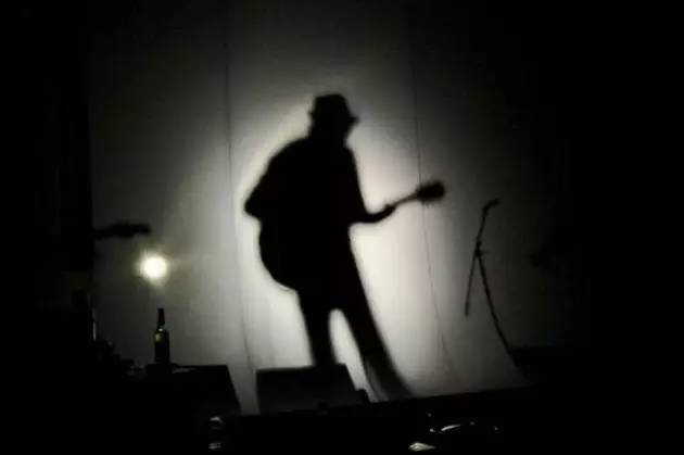 下一幕是一名歌者抱着吉他独自弹唱着讲述漂泊的歌曲,时间长达9分钟,在这9分钟里我们只能看到白幕后面一个人的剪影。