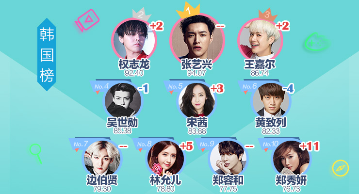 此外,本期排名韩国榜前三的分别是EXO成员张艺兴、权志龙、王嘉尔。