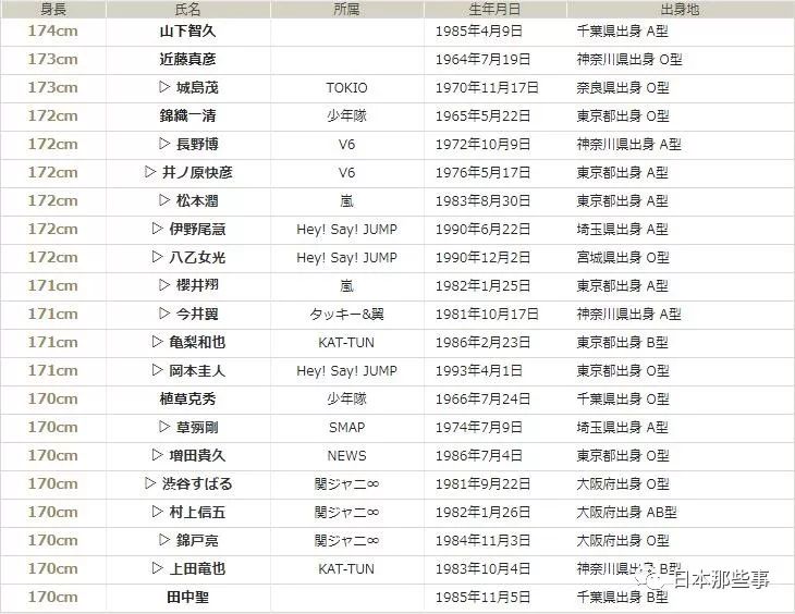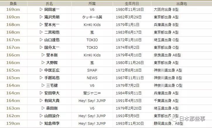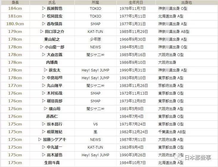 让我们看一下网络上流传的J家男星身高表。