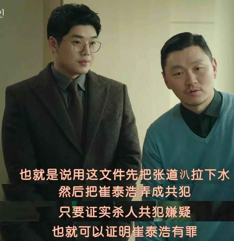 再者反派二号张道汃(公司副社长),几年前男二崔泰浩误伤同僚,你却替他隐瞒,并且杀掉了那位同僚。一直不明白编剧铺这个梗的目的,你不就是单纯想要经手公司而已嘛,何必自找麻烦背个命案呢?
