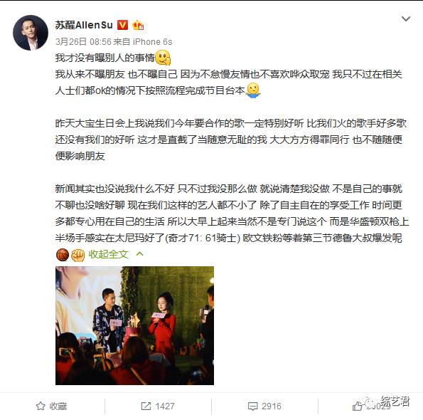 而苏醒第二天一早立马发文否认:我才没有曝别人的事情