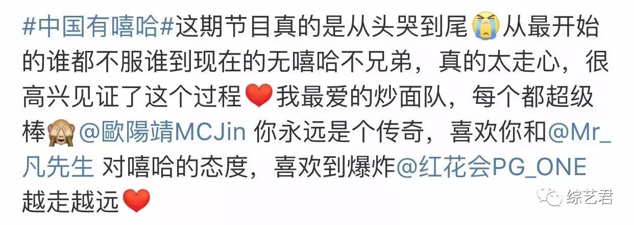 对嘻哈音乐不是hin懂的水君每次看完《中国有嘻哈》都会high一整天,但昨天这期,竟然让水君泪流满面...真不是我多愁善感,看看观众留言,从头哭到尾的人可不是少数!!!