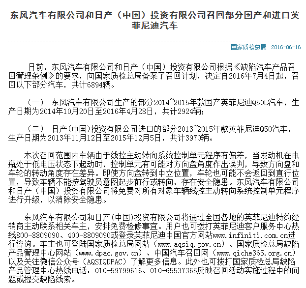 这是2016年6月召回时东风英菲尼迪官方所给出的理由。