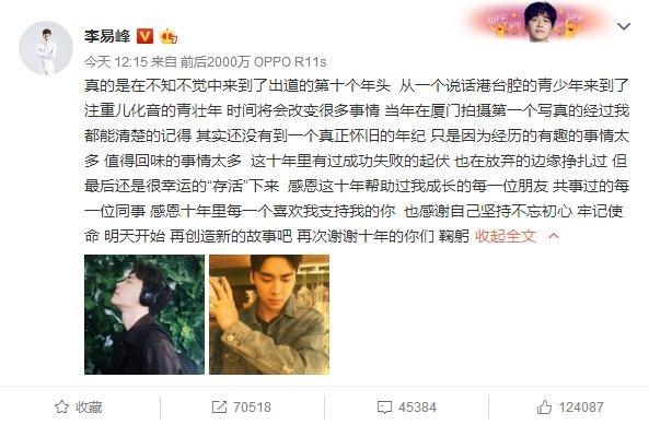 真的是在不知不觉中来到了出道的第十个年头 从一个说话港台腔的青少年来到了注重儿化音的青壮年 时间将会改变很多事情 当年在厦门拍摄第一个写真的经过我都能清楚的记得 其实还没有到一个真正怀旧的年纪 只是因为经历的有趣的事情太多 值得回味的事情太多 这十年里有过成功失败的起伏 也在放弃的边缘挣扎过 但最后还是很幸运的“存活”下来 感恩这十年帮助过我成长的每一位朋友 共事过的每一位同事 感恩十年里每一个喜欢我支持我的你 也感谢自己坚持不忘初心 牢记使命 明天开始 再创造新的故事吧 再次谢谢十年的你们 鞠躬