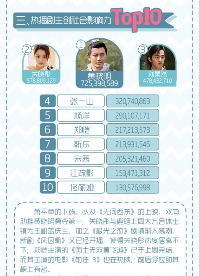 1905电影网讯 最新一期电视势力榜出炉,凭借《琅琊榜之风起长林》中令观众心碎不舍的柿子哥哥萧平章虐心下线,以及口碑作品《无问西东》的热映,黄晓明顺势登上主创势力榜榜首,观众经历了从“黄晓明能演好吗”到“黄晓明怎么就下线了”的直线上涨式转变,而长林世子萧平章的网播、台播两次下线也成功助推《琅琊榜之风起长林》相关话题的极速飙升,登顶称冠。