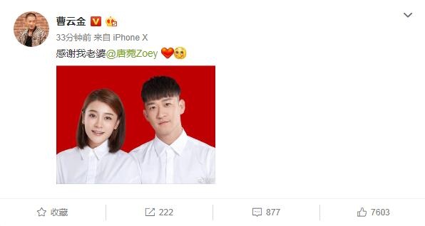 曹云金晒与唐菀结婚登记照宣布喜讯:感谢我老婆